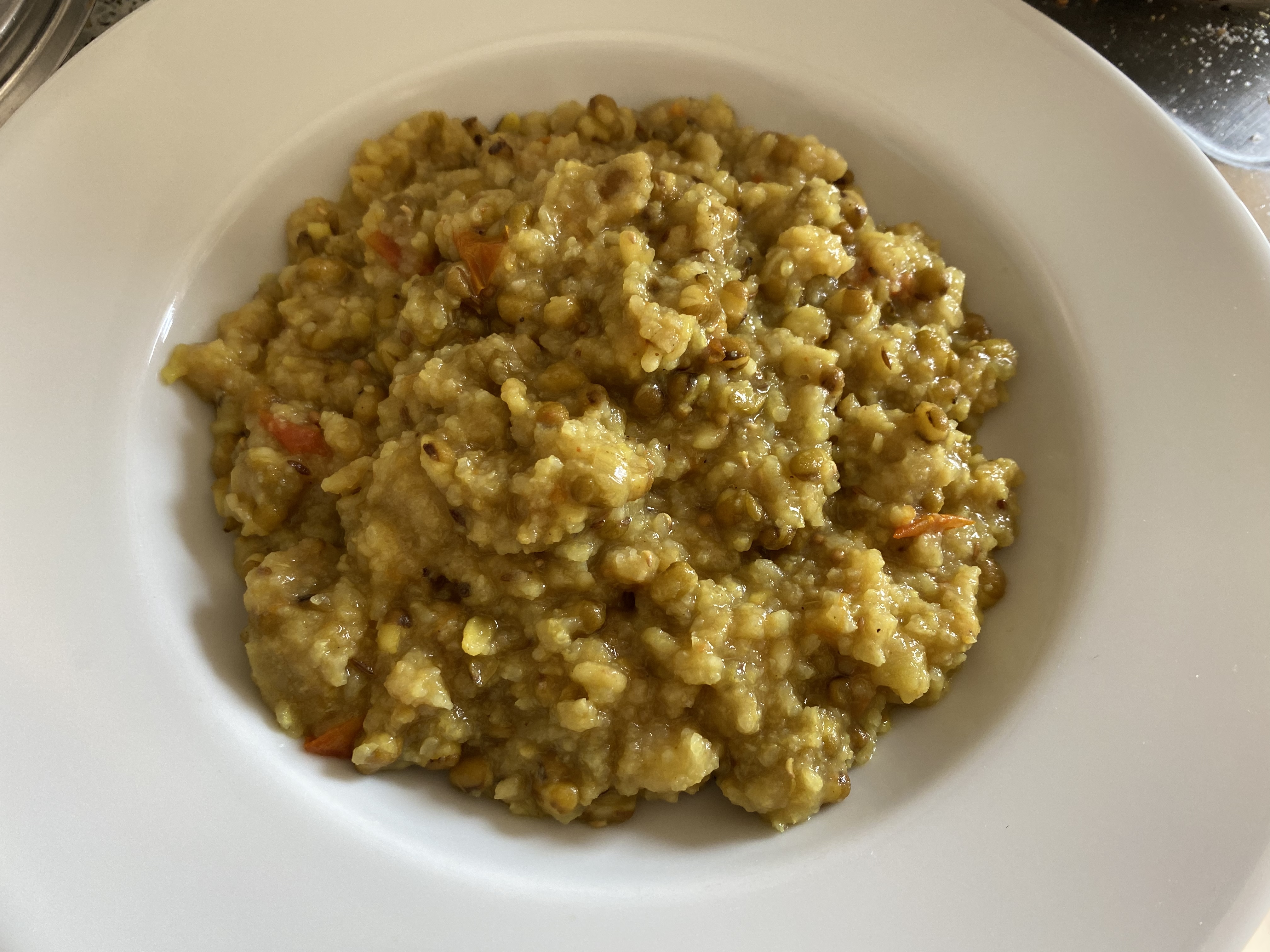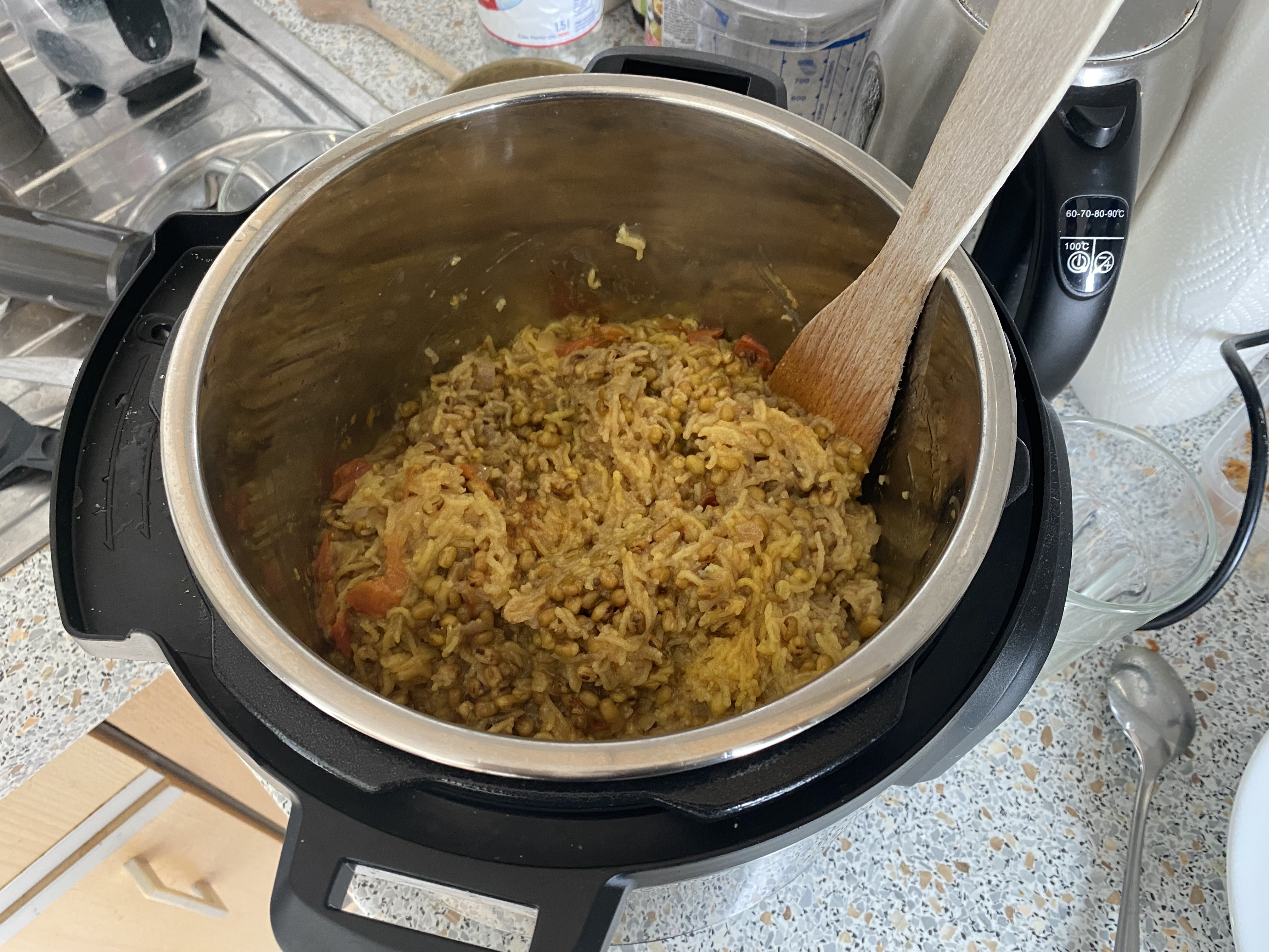 - 9 Minuten auf High Pressure kochen und direkt danach den Druck ablassen. Es sieht wahrscheinlich erst wässrig und weird aus, es muss dann nochmal gut durchgerührt werden, bis die Reiskörner etwas zerfallen und alles zu einem Matsch mit Textur wird.