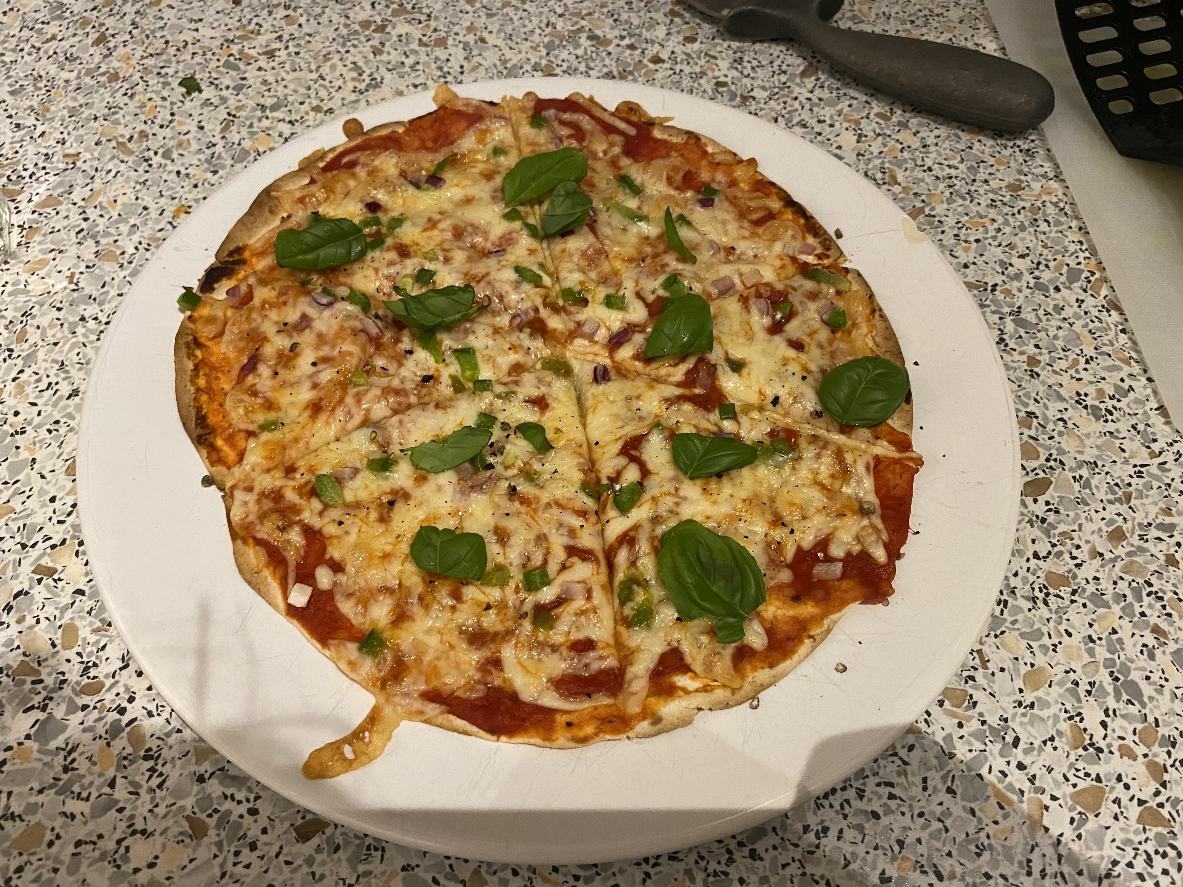 - Pizzabelag nach Wahl; ich nehme meistens klein gewürfelte Paprika und Zwiebeln